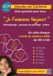 La Fondation OCH vous propose un parcours spirituel avec un beau thème pour 2026 : « Je t’aimerai toujours ». Chaque mardi de Carême, rendez-vous en visio de 13h à 14h pour un temps de témoignage, de partage et de prière. C’est gratuit et ouvert à tous… Lien de connexion envoyé à l’inscription.